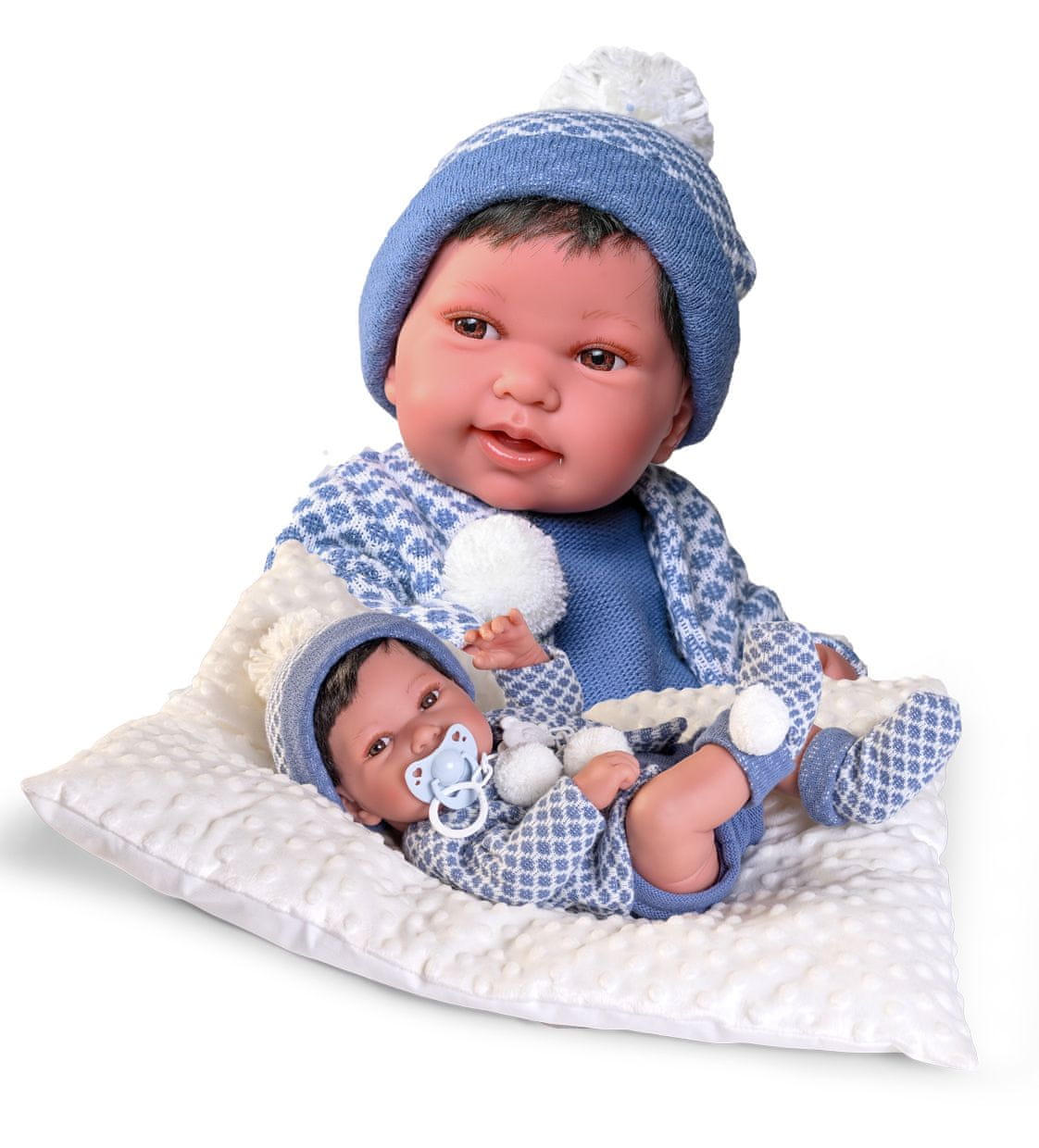 Ročno izdelana realistična španska lutka novorojenčka s popolnoma vinilnim telesom in realistično upodobitvijo različnih otroških potez in podrobnosti, vključno s spolom. Lutka je izdelana iz posebnega mehkega vinila, ki je zelo prijeten na otip. Oblačila nekaterih lutk so bila izdelana iz organskega bombaža, ki zagotavlja pridelavo ročno nabranega, ekološko pridelanega bombaža brez kemične obdelave. Podjetje Antonio Juan daje velik poudarek ekologiji in je zato prvo, ki v tem sektorju uporablja omenjeni bombaž. Velikost 42 cm. Pakirano v darilni škatli. Priporočena starost od 3 let.
