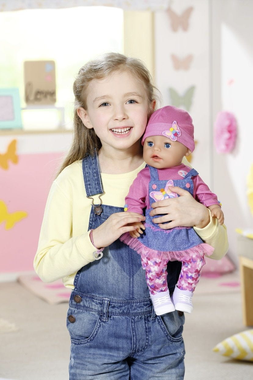 BABY born rada sanja o metuljih in pomponih. Tako je, ne o bonbonih, ampak o pomponih. Puhaste majhne kroglice in pisani metulji okrasijo celotno obleko BABY born. Nogavice so dobesedno prekrite z različnimi barvnimi metulji. Čolna kravata je prišita tudi na denim obleko z luštno zasnovo in z roza klobukom. Roza majica z dolgimi rokavi in ​lila teniskami, ki se odlično podajo k vsemu. Celoten opis