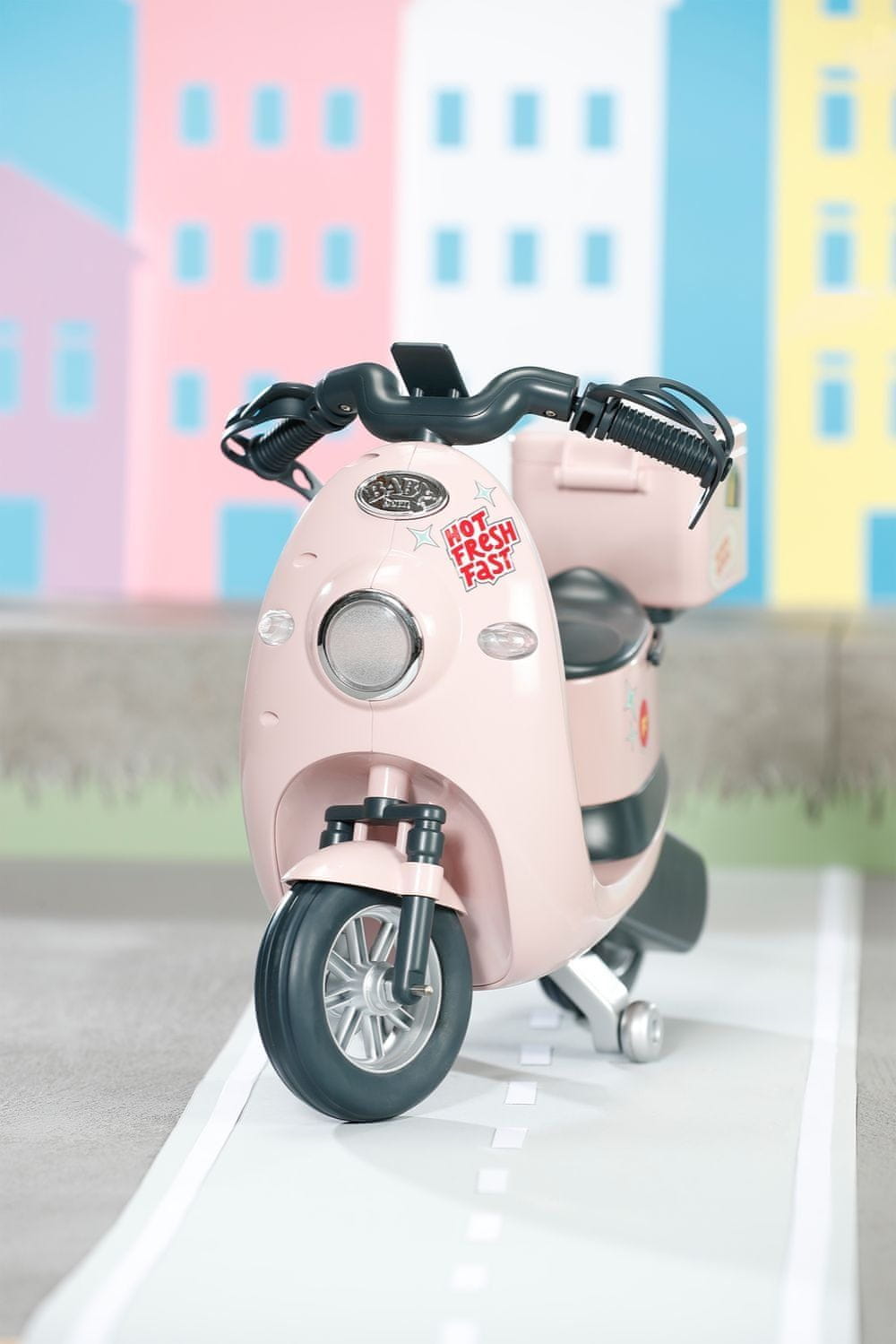 Najboljši način za premikanje po mestu je skuter. Zato se BABY born odpravlja na ulice z novim sodobnim električnim skuterjem. Upravljati ga je mogoče z daljinskim upravljalnikom, vozi pa naprej in nazaj. Seveda je treba takšen električni skuter tudi polniti. Ko je priključen na polnilno postajo, se prižge zadnja lučka, da je igra polnjenja pristna (samo polnjenje ni resnično). Varno potovanje, BABY born!
