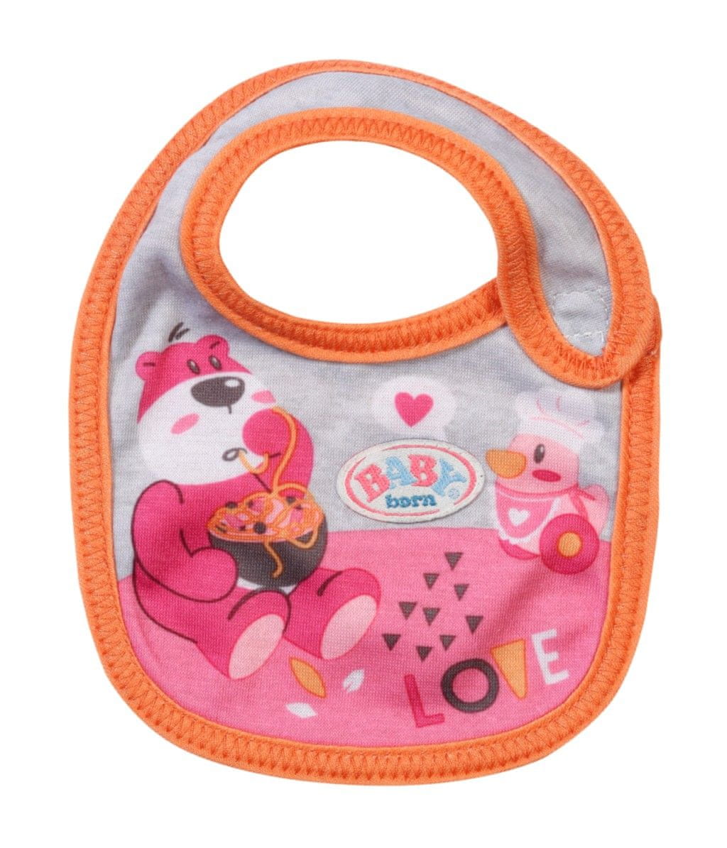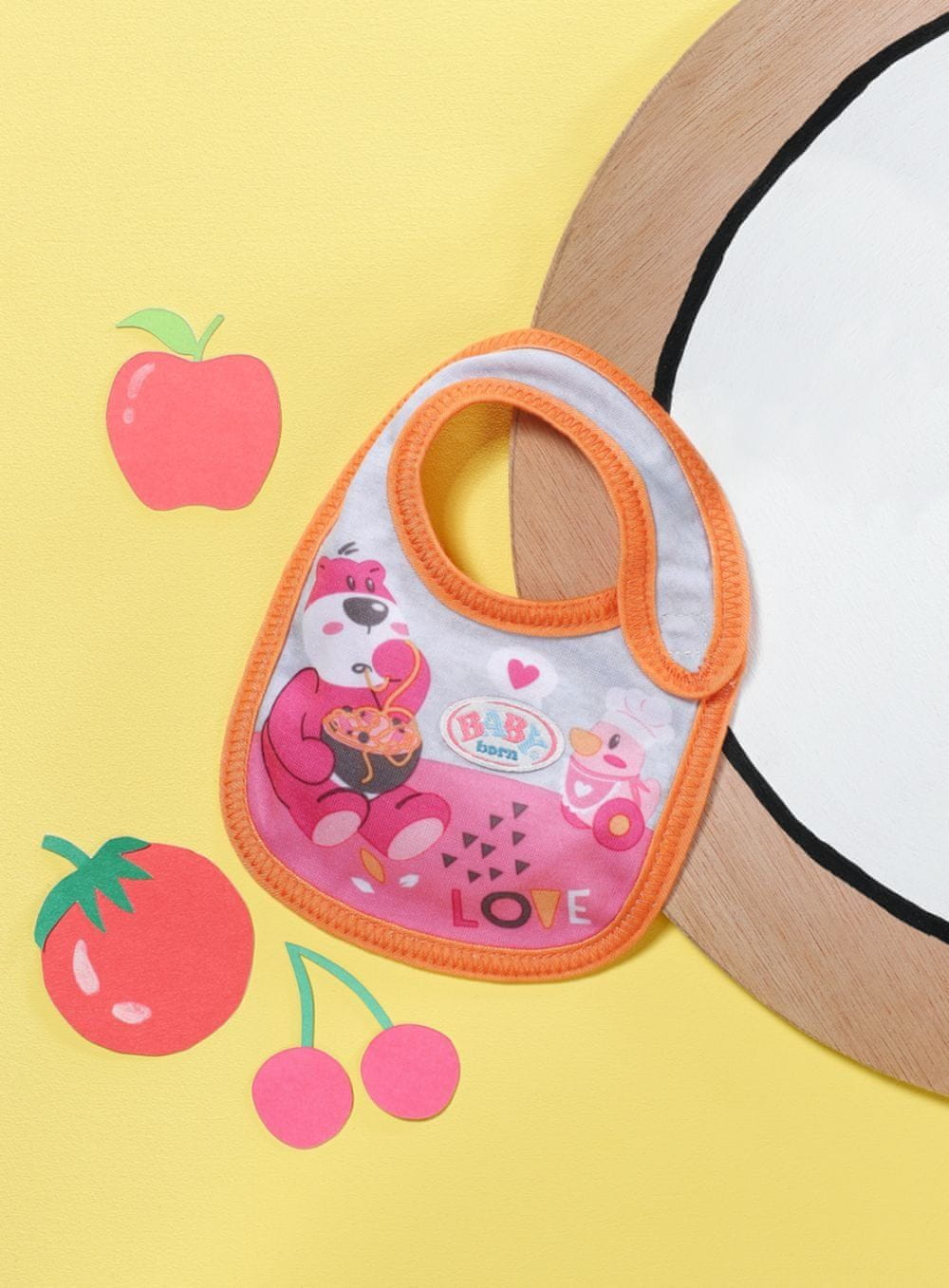 Nekdo se je znojil. Takoj ko BABY born pije mleko ali je kosmiče, se vedno nekaj razlije. Bolj ko uživa v hrani, bolj se umaže. Zato ima mali jedec pripravljena dva rezervna slinčka. Na rožnatem slinčku je slika zajčka Benna v kuhinji. On pozna najboljše recepte za korenje. Na oranžnem slinčku pa medved Bruno veselo pokuha. Vendar ima rad le špagete, ki jih je pripravila račka Berta.