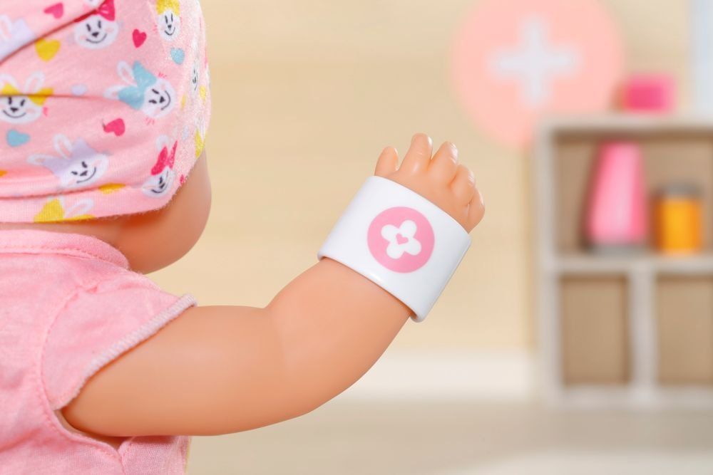 „Au, to boli!“ Ups, po licih BABYborna se kot grah kotalijo solze. Spotikala se je ob sestrino torbo za vrtec. Ta mala nerodnica vedno pusti svoje stvari ležati sredi hodnika. Bratec hitro steče po komplet prve pomoči. Kot pravi reševalec si nadene rožnato pelerino. Nato izvleče vse, kar potrebuje za zdravljenje zlomljenega kolena BABY born. Tubo mazila in povoj, ki ga s škarjami še malo pristriže. Ko BABY born zagleda škatlico z zdravili in žličko za zdravila, zaviha oči. Na srečo zdravila še ne potrebuje. Brat reševalec mu želi namesto tega izmeriti temperaturo. Mala kaskaderka ima zaradi vznemirjenja nekoliko povišano temperaturo. Morda bi lahko grelno stekleničko spremenili v hladilno blazinico. Nato bratec vseh 9 medicinskih pripomočkov pospravi nazaj v torbo iz blaga, ki jo krasi slika medicinske račke Berte.