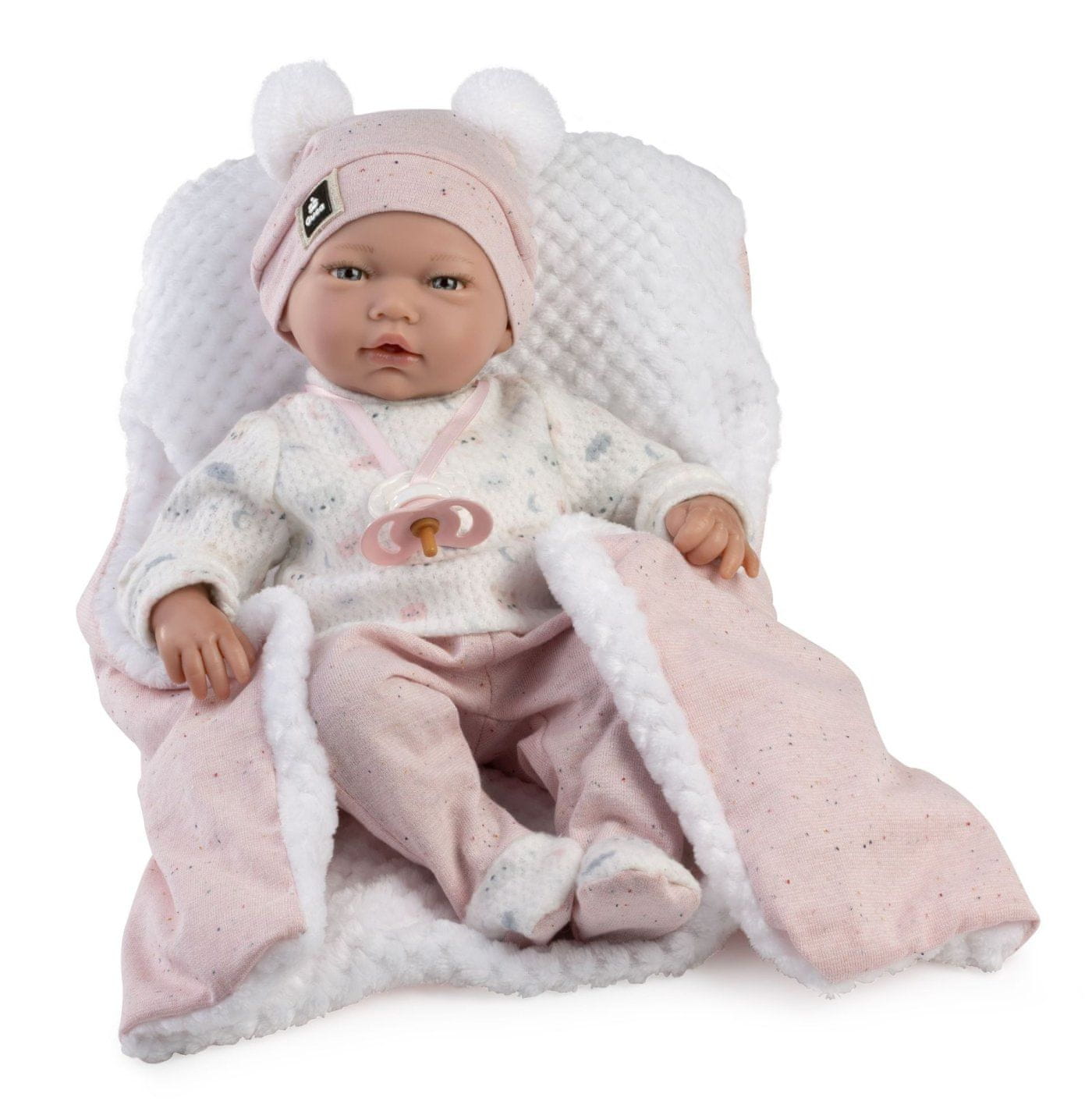 Brezzvočna lutka z mehkim telesom iz blaga. Roke in noge so na telo pritrjene s sklepom. Dojenček je ležeč in lahko tudi sedi. Dojka, ki je priložena v paketu, služi le kot pripomoček. Velikost 38 cm. Ročno izdelana v Španiji, pakirana v darilni škatli. Priporočena starost od 3. leta dalje.
