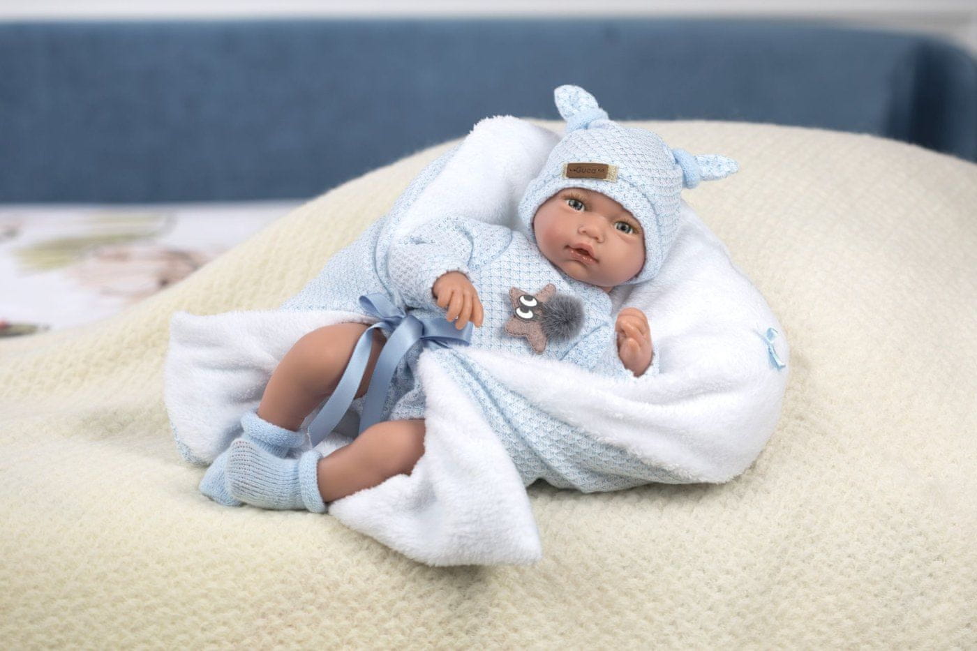 Zvočna lutka z mehkim tekstilnim telesom, ki ob pritisku na prsi začne oddajati realističen zvok smejočega se dojenčka. Roke in noge so s sklepom pritrjene na telo. Dojenčka je mogoče nastavljati in se lahko celo usede. Velikost 38 cm. Ročno izdelano v Španiji, pakirano v darilni škatli. Priporočena starost od 3. leta dalje. Vključuje 3 baterije LR44 z navodili za zamenjavo. Baterije so potrošni material, zato njihovo praznjenje ni razlog za reklamacijo lutke.
