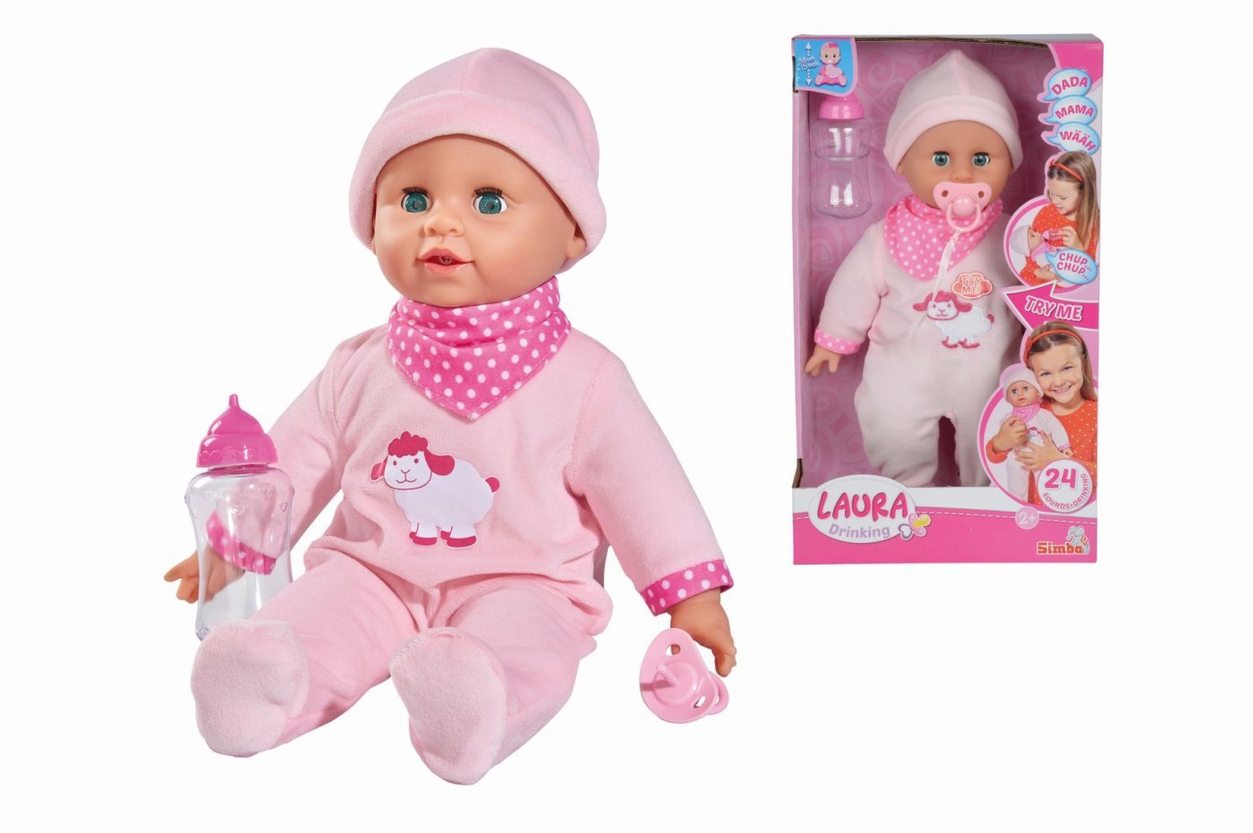 Laura ima mehko telo, zapira oči, pije iz stekleničke in izdaja 24 zvokov. Priložena sta steklenička in duda. Velikost lutke je 38 cm.