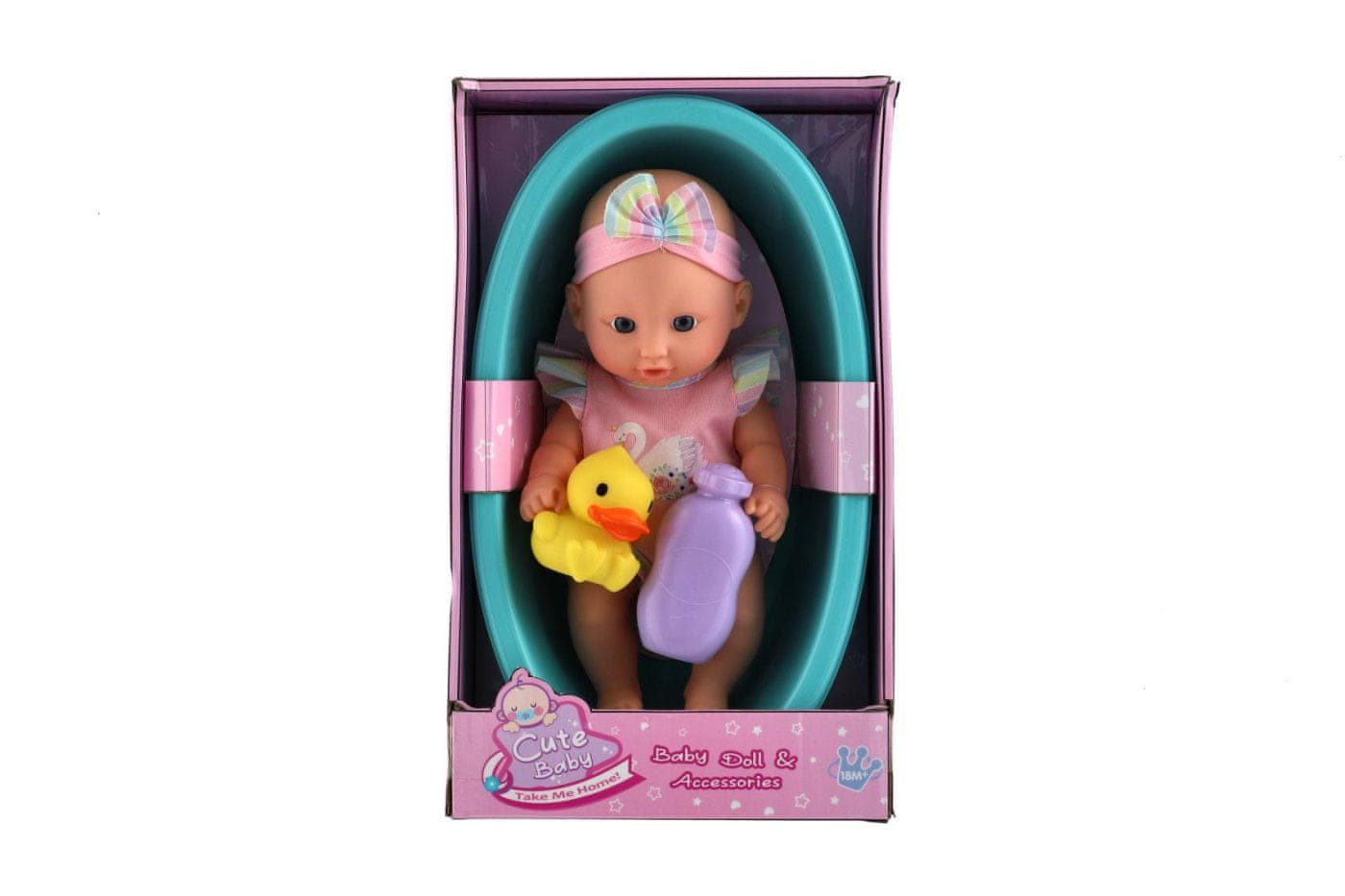 Ta lutka bo zagotovo razveselila vsako deklico. Dojenček je v kadi z račko, kar bo cenila vsaka ljubiteljica vode in kopanja. Njen prikupni obraz pa bo zagotovo očaral ne le majhne deklice. Velikost dojenčka: 26 cm Velikost paketa: 20 × 33 × 10 cm Primerno za otroke od 3. leta dalje