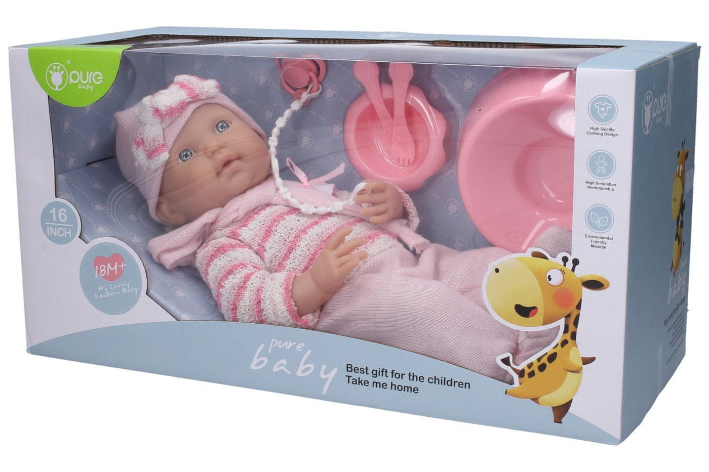 Dojenček v rožnatem kombinezonu. Velikost 40 cm. Vključuje: dojenčka, lonček, skledo, pribor, dudo.