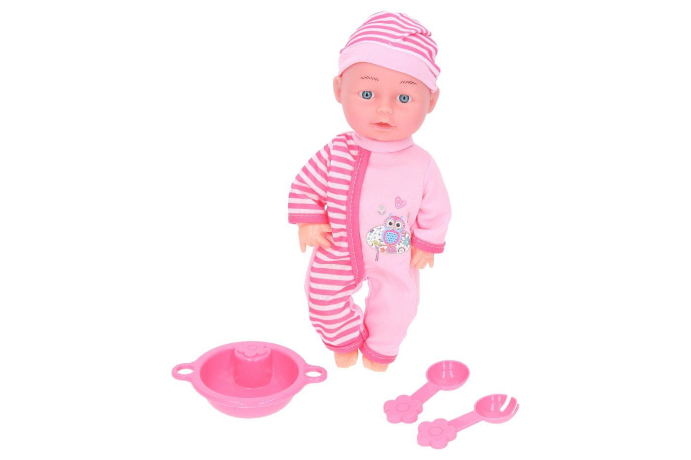Dojenček z dodatki. Velikost 26 cm. Vključuje dojenčka, skledo, 2 žlici. 2 različici – roza, vijolična.