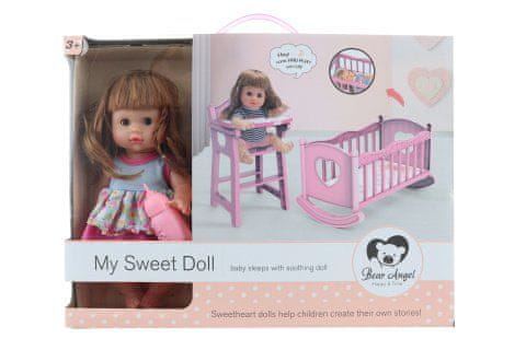 Velik komplet za lutke z zibelko. Lutka deluje na baterije – 3×AG13 (vključene) in izdaja otroške zvoke in besede. Lutka piči. Material plastika + poliester. Pakirano v škatli. Dimenzije paketa približno 36,5×35×10,5 cm. Starost 3+
