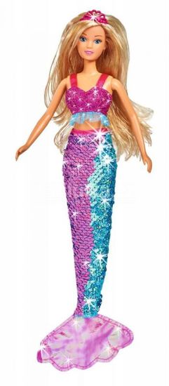 Krasna lutka Steffi kot neverjetna morska deklica. Njena čarobna plavut je narejena iz pisanih bleščic, ki jih je mogoče vrteti in spreminjati njihovo barvo! Z dvema sponkama z bleščicami jo lahko naredite še lepšo in ujemate njene lase z njeno plavutjo. Visoka je 29 cm in je primerna za otroke od 3. leta starosti dalje.