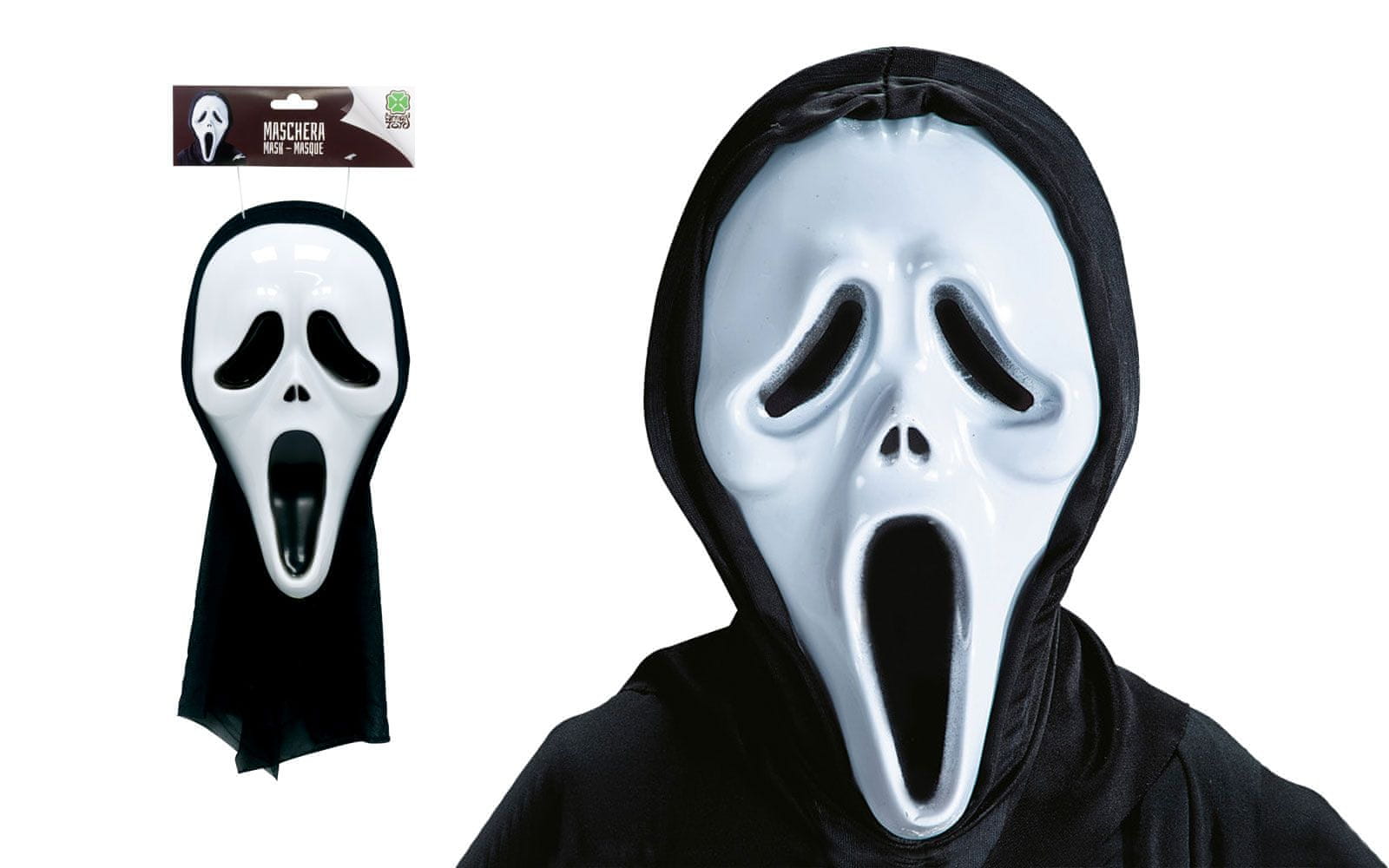 Pustna maska duh iz bele plastike s kapuco iz črnega blaga. Celoten opis