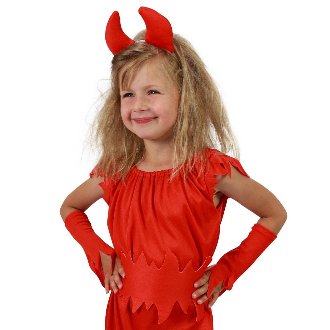 Peklensko rdeč pustni kostum z motivom hudiča, velikost S, je namenjen deklicam v starostnem obdobju 4–6 let (105–116 cm). Celoten opis