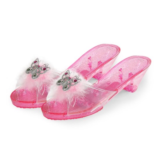 Ekskluzivnih čevljev ne sme zamuditi nobena princeska! 20 cm dolgi čevlji so izdelani iz PVC in okrašeni s perjem in osupljivim metuljčkom. Poleg tega se bleščijo po vsem telesu!
