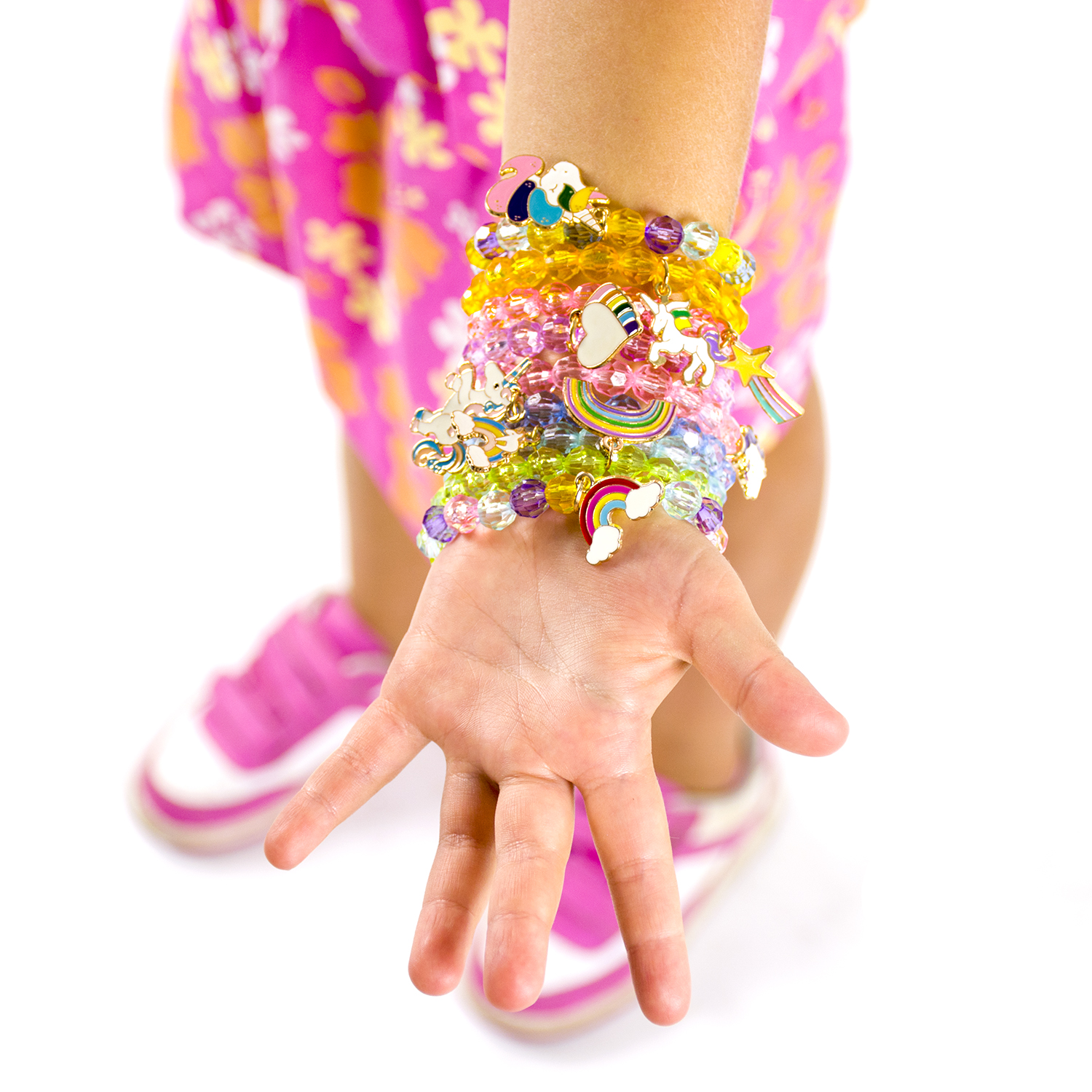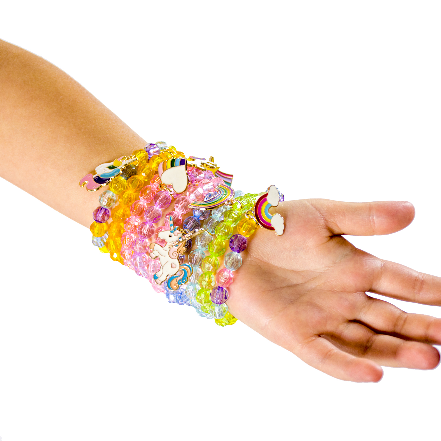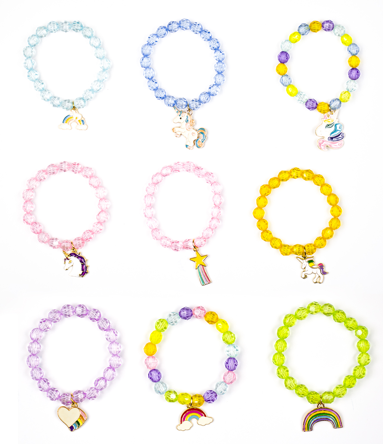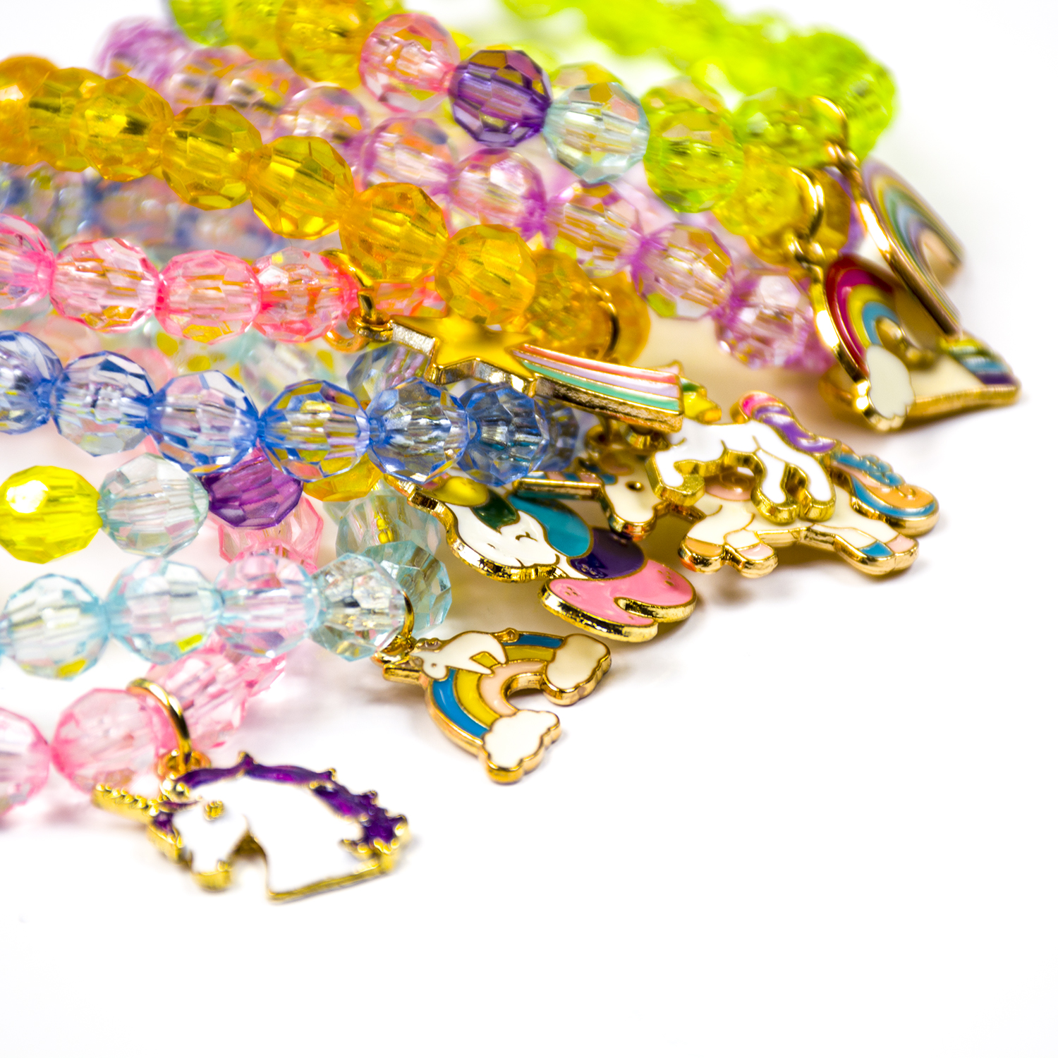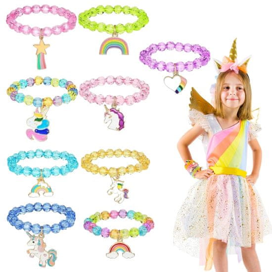 pisanih zapestnic z biseri , vsaka z drugačnim očarljivim obeskom. Zahvaljujoč njim lahko deklice izbirajo glede na svoje vsakodnevne obleke in razpoloženje ter dodajo še več obeskov. ✨ Nežne in svetle perlice: Zapestnice z biseri samoroga imajo pisane kristalne perlice