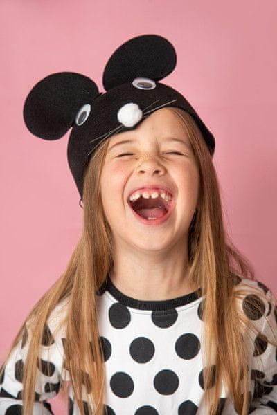 Klobuk v obliki miške, črne barve, premer odprtine za glavo približno 19 cm, mere približno 19,5 × 19,5 × 9,5 cm.