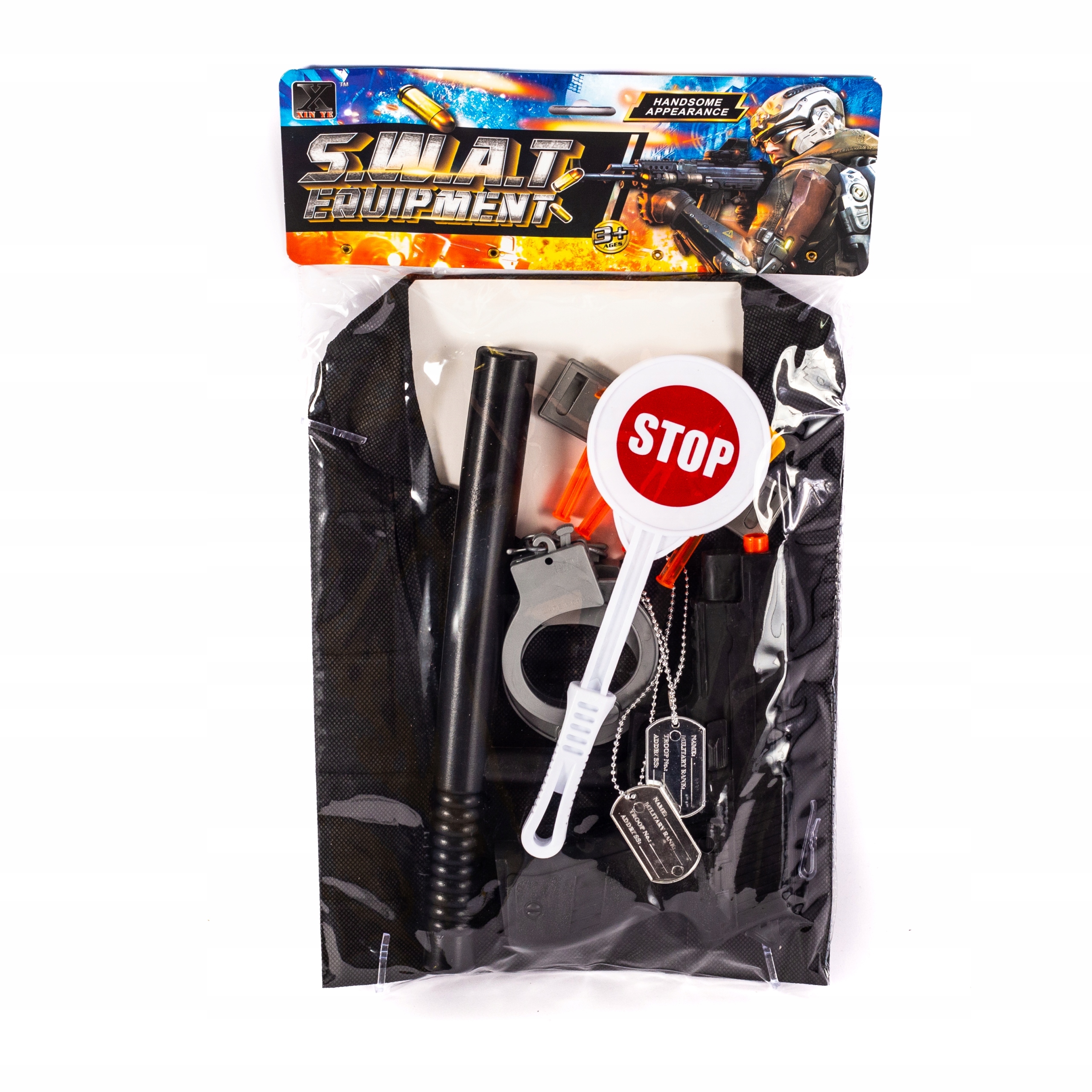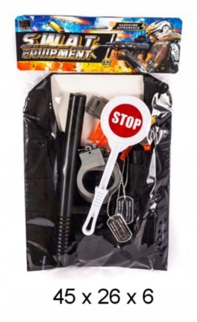 • komplet vključuje: telovnik, lisice, liziko, palico, pištolo za puščice