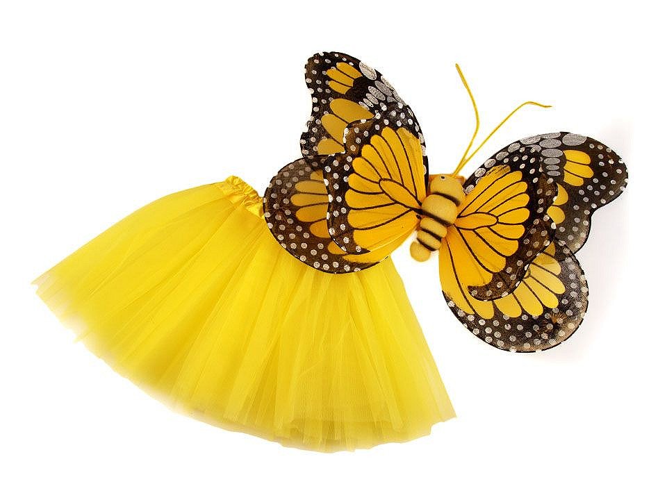 S karnevalskim kompletom se bo vsaka deklica spremenila v metulja. Kostum sestavljajo krilo iz tila in krila, ki so dvojna, ojačana in pritrjena z gumicami. Mere kril so 37 × 48 cm. Dolžina krila je približno 27 cm. Obseg krila je od 40 do 80 cm.