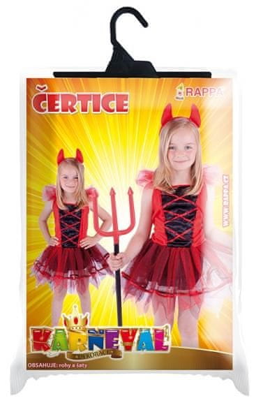 Odličen kostum za vsakega malega hudiča! Obleka je spredaj okrašena z bleščicami, na ramenih pa so ognjeni cvetovi. Krilo je v slogu TUTU v rdeči in črni barvi. Zadnji del kostuma je okrašen s hudičevim repom. Kostum dopolnjujejo rogovi na naglavnem traku in hudičeve rokavice. S tem neverjetnim kostumom prestrašite svoje prijatelje. Kostum velikosti M je namenjen deklicam, starim od 6 do 8 let (116–128 cm). Vilice niso vključene v kostum.