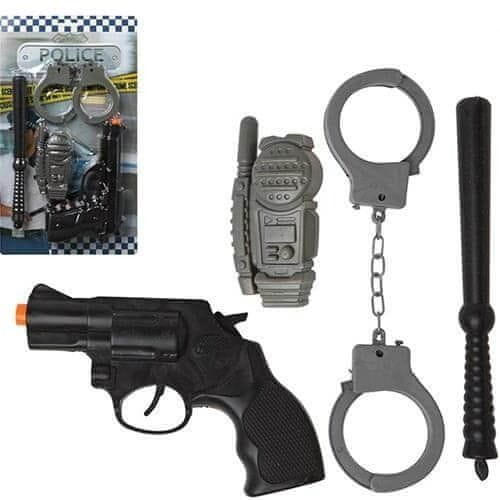 Set vsebuje srebrne lisice, črn pendrek, črno pištolo ter srebrn voki toki. Celoten opis