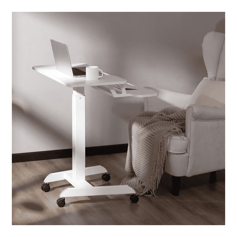 Praktična in mobilna miza ErgoOffice ER444 bele barve. Zahvaljujoč sistemu plinskih vzmeti je mogoče višino mize brezstopenjsko nastaviti od 80 do 120 cm. Izboljša ergonomijo vašega delovnega mesta in zagotavlja večjo učinkovitost pri delu.