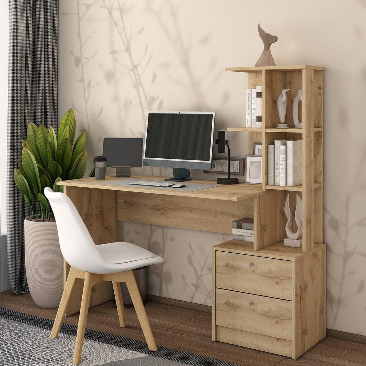 Eleganten dizajn in moderen izgled pisalne mize s polico TALENT T7 P bo odličen ne le funkcionalen, ampak tudi dizajnerski element marsikatere študentske sobe ali pisarne. Njegovo trdnost in stabilnost zagotavlja visokokakovosten material, iz katerega je izdelan, dizajn v barvi hrasta tahoe pa se popolnoma prilega vsakemu notranjemu stilu. Poleg prostornega delovnega pulta ponuja miza tudi odprt regal ob strani mize s policami, v njenem spodnjem delu pa sta dva praktična predala, opremljena z ročaji za lažje odpiranje. Njegove skupne mere so (ŠxGxV): 136×55×138 cm in je dostavljen razstavljen. Praktičnost, funkcionalnost in dizajn v enem, to je sodobna pisalna miza s polico Talent T7 P.