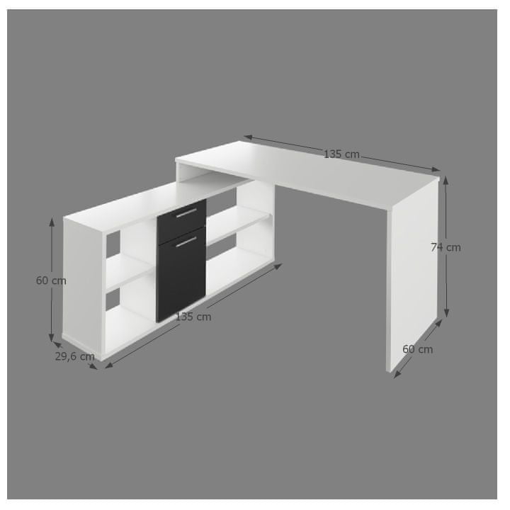Kotna miza NOE NEW z veliko prostora za shranjevanje zagotavlja dovolj prostora za delo. Sestavljen je iz dveh delov. En del je klasična PC mizica, drugi del pa je opremljen s predalom, omarico in enostavnimi policami. Gre za kakovosten slovaški izdelek, ki je primeren tudi za umestitev v prostor. Material za izdelavo je laminiran DTD v barvi bela/črna, na voljo pa so tudi druge barve. Miza je univerzalna, kar pomeni, da jo lahko zložite na levo ali desno stran. Zahvaljujoč tej mizi bo pisarna postala vaš najljubši prostor. Velikost glavne mize je 135×60×74 cm. Velikost dodatne mize je 135×29,6×60 cm.