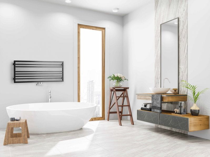 Dizajnerski radiator s čistimi linijami, izdelan iz navpičnih in vodoravnih palic za moderne kopalnice. Glavne prednosti Sodoben in eleganten videz Visoka strukturna togost zaradi okvirne konstrukcije Na voljo v več velikostih, vključno z različicama L in XL Uporaba Idealen za kopalnice, stranišča in bivalne prostore Primeren za centralno ali kombinirano ogrevanje Značilnosti Konstrukcija iz pravokotnih jeklenih profilov (palic) Ravne cevi omogočajo enostavno obešanje brisač Za različici L in XL ni priporočljivo samo električno ogrevanje Tehnični parametri Tip: Kopalniški radiator Priključitev: Centralno ali stransko Ogrevanje: Centralno ali kombinirano (električna grelna palica) Lega: Vodoravna Dimenzije 905 × 480 mm Moč 75/65°C: 244 W Priporočena moč električne grelne palice: Ni priporočljivo Barva: Mat črna RAL 9005 Radiatorji so ključni element, ki prispeva k udobju in toplini v naših domovih. Pravilno delujoč ogrevalni sistem z visokokakovostnimi radiatorji je zagotovilo, da se bomo v svojem domu počutili udobno in toplo, tudi ko je zunaj hladno. Ogrevanje po meri podjetja Richter + Frenzel. Naši vodovodni in ogrevalni sistemi zagotavljajo optimalno toplotno udobje.