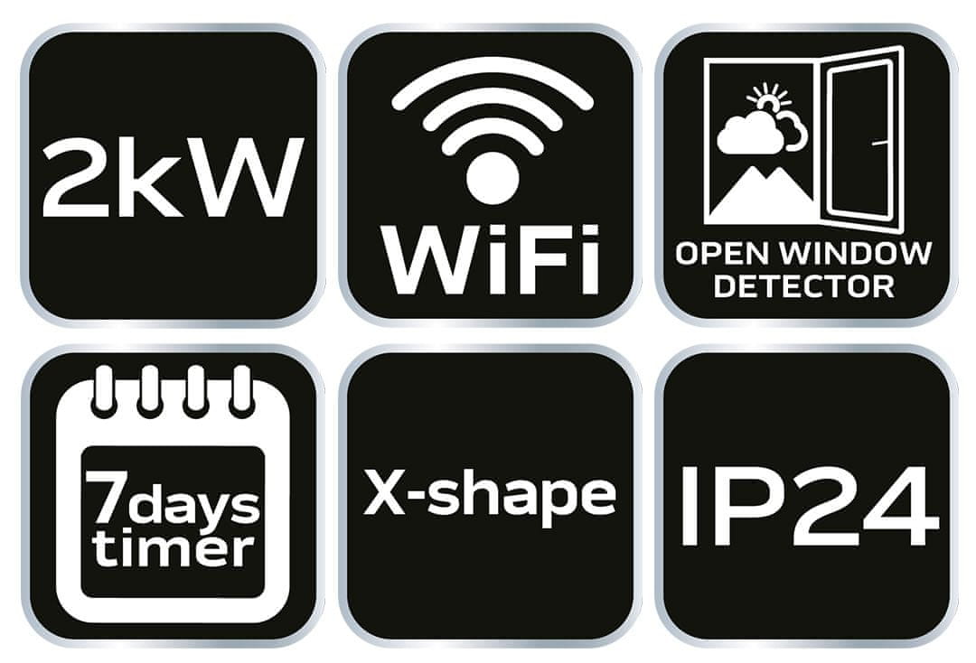 Ta električni konvektorski grelec z močjo 2000 W (ref. št. 90–095) se ponaša z moderno in elegantno obliko. Izdelan je iz visoko trdnega kaljenega stekla. Aluminijast ogrevalni sistem nove generacije deluje tiho, brez vonja ter brez plina ali dima. Toploto začutite takoj po vklopu grelca. LED-zaslon na dotik je preprost in intuitiven za uporabo. Naprava je opremljena s termostatom z nadzorom temperature od 5 do 45 °C. Daljinski upravljalnik poenostavlja programiranje načina delovanja. 24-urni program lahko upravljate z daljinskim upravljalnikom ali z zaslonom na dotik. Grelec ima zaščito pred pregrevanjem, zaščito pred prevrnitvijo in varnostne funkcije za otroke za varno delovanje. Ima tudi funkcijo proti zmrzovanju za vzdrževanje minimalne temperature v prostoru ter zaznavanje odprtega okna. Grelec je mogoče postaviti na tla ali na steno. Izdelek deluje z aplikacijo TUYA, ki omogoča tedensko programiranje delovanja naprave. Natančno načrtovanje temperature se prevede v učinkovito porabo energije. Zaslon na dotik omogoča 24-urno programiranje. Ta izdelek je primeren le za občasno uporabo ali za uporabo v dobro izoliranih prostorih.