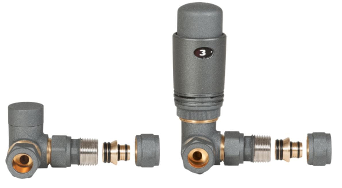 Reverzibilni kotni termostatski ventil. Tehnični podatki: – Površinska obdelava: Grafit; – Uporaba: priključitev kopalniškega radiatorja na bakreno/PEX instalacijo; – Uporaben kot leva ali desna izvedba; – Priključki za radiator 1/2" BSP za 15 mm bakrene ali 16 mm PEX instalacije; – Termostatska glava M30×1,5.