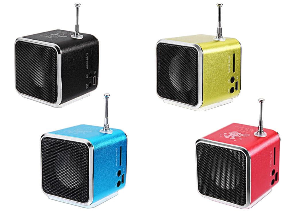- SPECIFIKACIJA – črna barva; material ohišja: aluminij; zaslon: LCD; moč: 3W; frekvenčni odziv: 150 – 18.000 MHz; občutljivost: 80 dB; vtičnice: AUX IN, mini-jack 3,5 mm, miniUSB, čitalec kartic microSD / TF; format predvajanja: mp3; polnjenje: USB kabel; USB – mikro USB dolžina kabla: ~ 50 cm; litijeva baterija: 300mAh; čas delovanja: 2h; izhod za slušalke: mini jack; mere z zloženo anteno (višina / širina / dolžina): 5×5×5cm; teža: 0,135 kg
