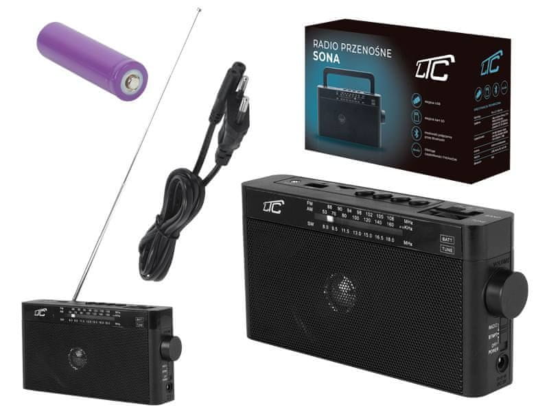 Napajanje: AC 230 V / 50 HzEnosmerni tok: 5V 800mAPolnilna Li-ion 18650 baterija, 3,7 V, 1200 mAhPodprte frekvence: FM: 88 – 108 MHz @ 10 dBAM: 530 – 1600 KHz pri 86 dBSW: 8,0 – 18,0 MHz pri 17 dBBrezžična povezljivost: BluetoothPriključki: 1 x AC vtičnica, 1 x DC vtičnica, 1 x vtičnica USB-A1 x čitalnik kartic microSD, 1 x AUX vNatančna nastavitev: DaTeleskopska antena: DaDolžina antene: 35 cmČrna barvaMere: 190 × 47 × 96 mm Vključeno:1 x radio LTC