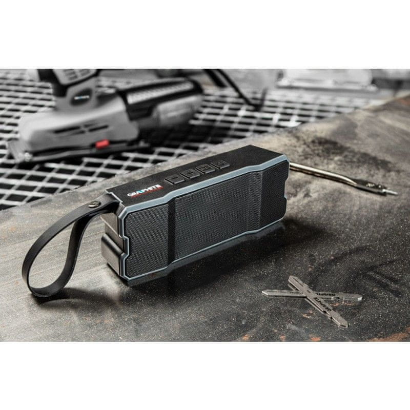 Zahvaljujoč temu in tudi zaradi visoke mobilnosti bo GRAFITNI zvočnik pogost gost v vaši orodjarni!