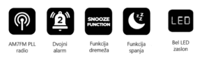 Budilka ponuja dvojno nastavitev alarma, kar je praktično za pare ali za različne urnike v enem dnevu. Čas je prikazan v 24-urnem formatu, kar zagotavlja natančnost in preglednost.