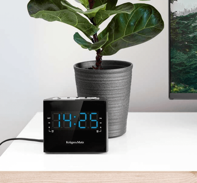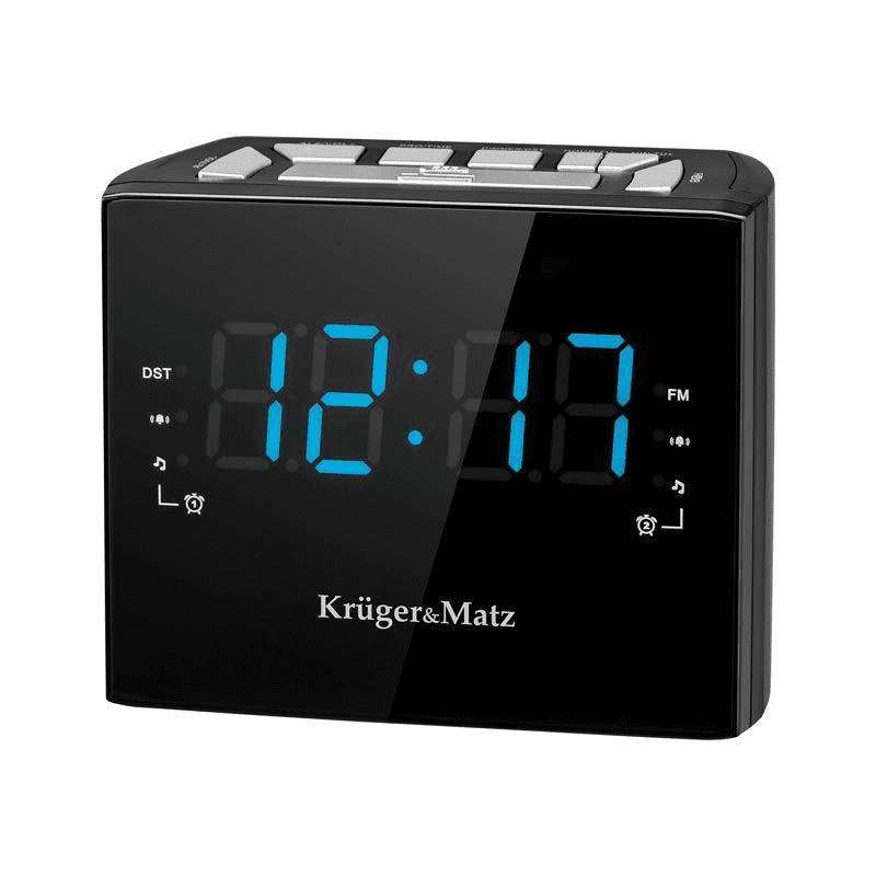 Če želite, da je vaše jutranje prebujanje malo lepše, uporabite radijsko budilko Kruger & Matz KM 821. Prebujanje ob zvokih vaše najljubše radijske postaje namesto klasičnega brenčala je recept za nasmeh že od jutra. Še več, da naprava omogoča nastavitev dveh takih alarmov in omogoča shranjevanje dvajset radijskih postaj.Za ljudi, ki še potrebujejo trenutek, da se zbudijo, je funkcija dremeža popolna možnost. Še več, ura z budilko in radiem Kruger & Matz ima časovnik, ki vam bo omogočil, da mirno zaspite ob vaši najljubši radijski postaji, saj se po nastavljenem času naprava sama izklopi.Velik zaslon je zaprt v elegantnem črnem ohišju z jasno razporejenimi funkcijskimi gumbi. Torej, ne glede na dekor, ki ga imate v spalnici, se bo naprava ujemala z njenim dekorjem in bo popolna dopolnitev. – Prikaz ure z modrimi številkami