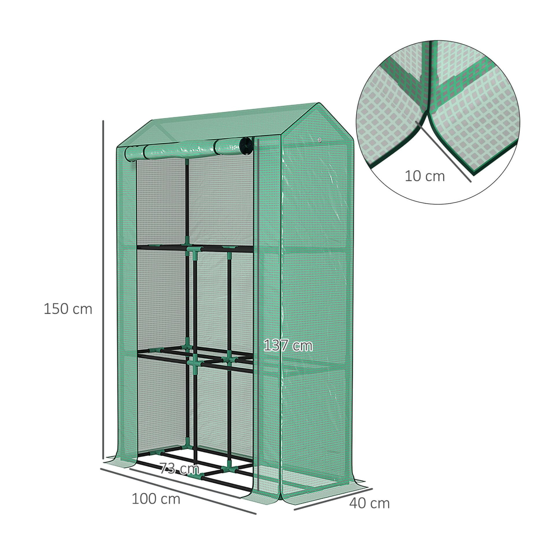 Rastlinjak je opremljen s tremi policami, ima rolo vrata in lahko konstrukcijo, tako da ga lahko enostavno premaknete glede na potrebe.