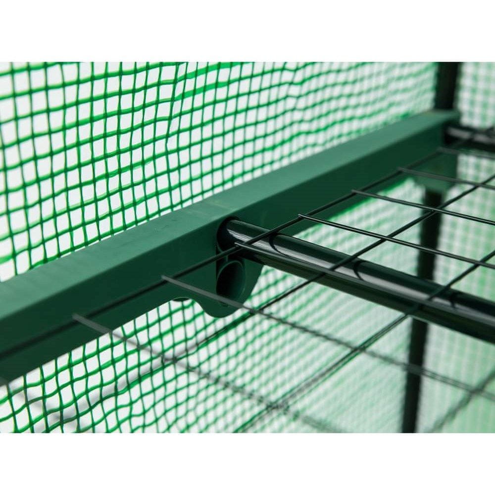 Hiška iz folije je idealna za gojenje sadik ali pospeševanje rasti zelenjave. Na sprednji strani ima vhodno odprtino z dvema zadrgama. Folija, ojačana z mrežo, je iz poliestra 140 g/m2 v prozorno zeleni barvi. Opremljen je s 4 policami za priročno postavitev predhodno vzgojenih sadik.