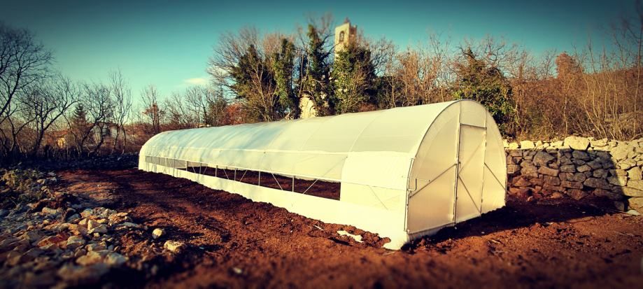 Za postavitev rastlinjaka temelji niso potrebni. Enostavno sidra zabijemo v zemljo in na njih nataknemo loke.
