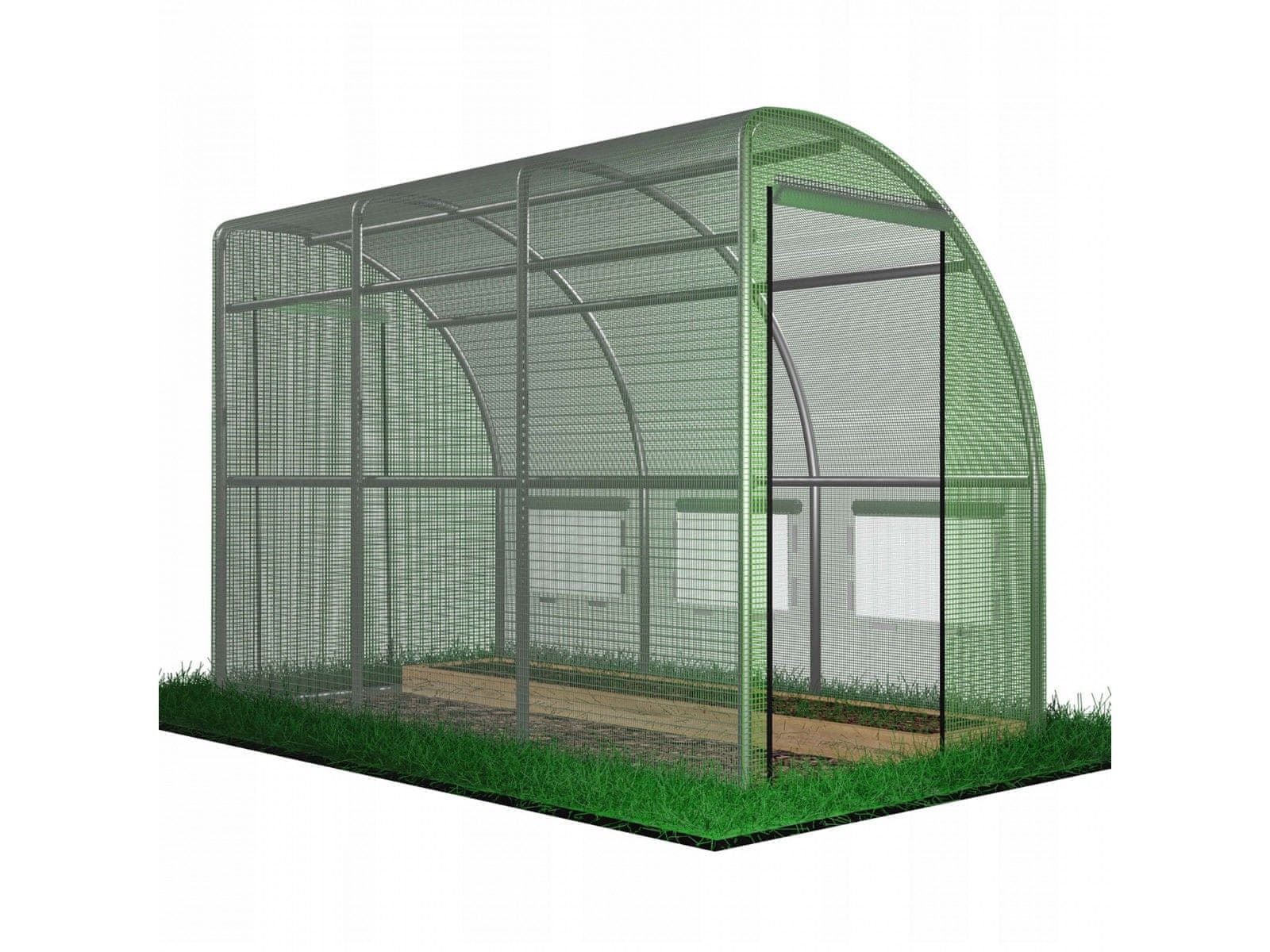 Trije okni z mrežami proti komarjem na ježka omogočajo enostaven dostop do pridelkov, široke zvijajoče se vrata z zadrgo pa olajšajo premikanje večjih rastlin.