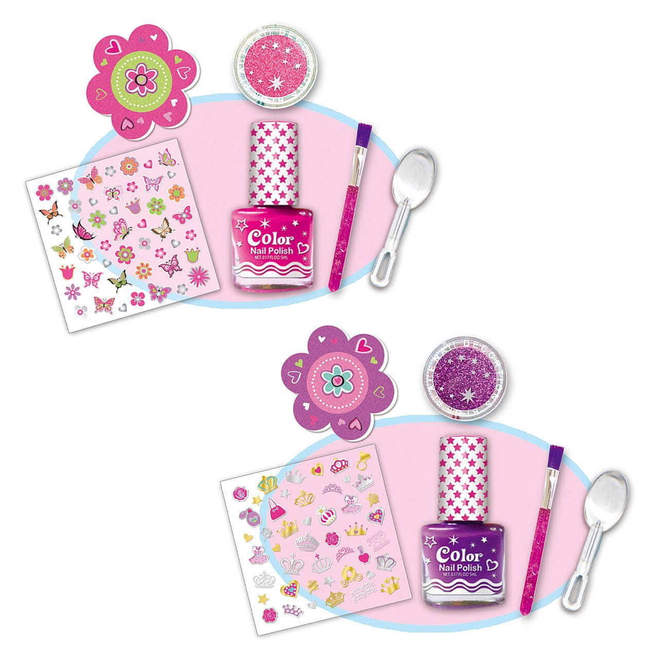 Značilnosti: Vloge: Komplet za lakiranje in lepšanje nohtov. Več kot 50 delov/paket. Vsebuje: Vsebuje: lak za nohte 5 ml. Posoda z bleščicami 1 g. Aplikator za nanašanje bleščic. Čopič za odstranjevanje odvečnih bleščic. Pila za nohte. Okrasne nalepke za nohte. Celoten opis