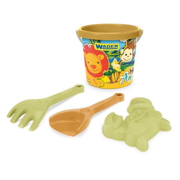 - komplet vsebuje 4 elemente: lopato, grablje, kalup v obliki rakovice in 1-litrsko vedro z grafiko Divje Afrike