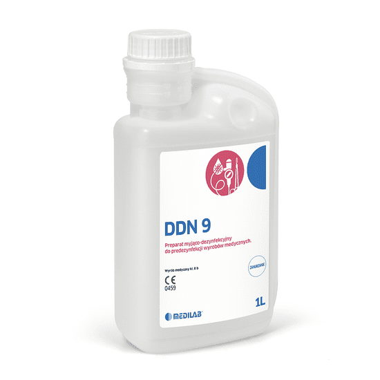 DDN 9 je koncentrirano sredstvo za čiščenje in razkuževanje instrumentov, endoskopov in drugih medicinskih pripomočkov v 1-litrski steklenici.