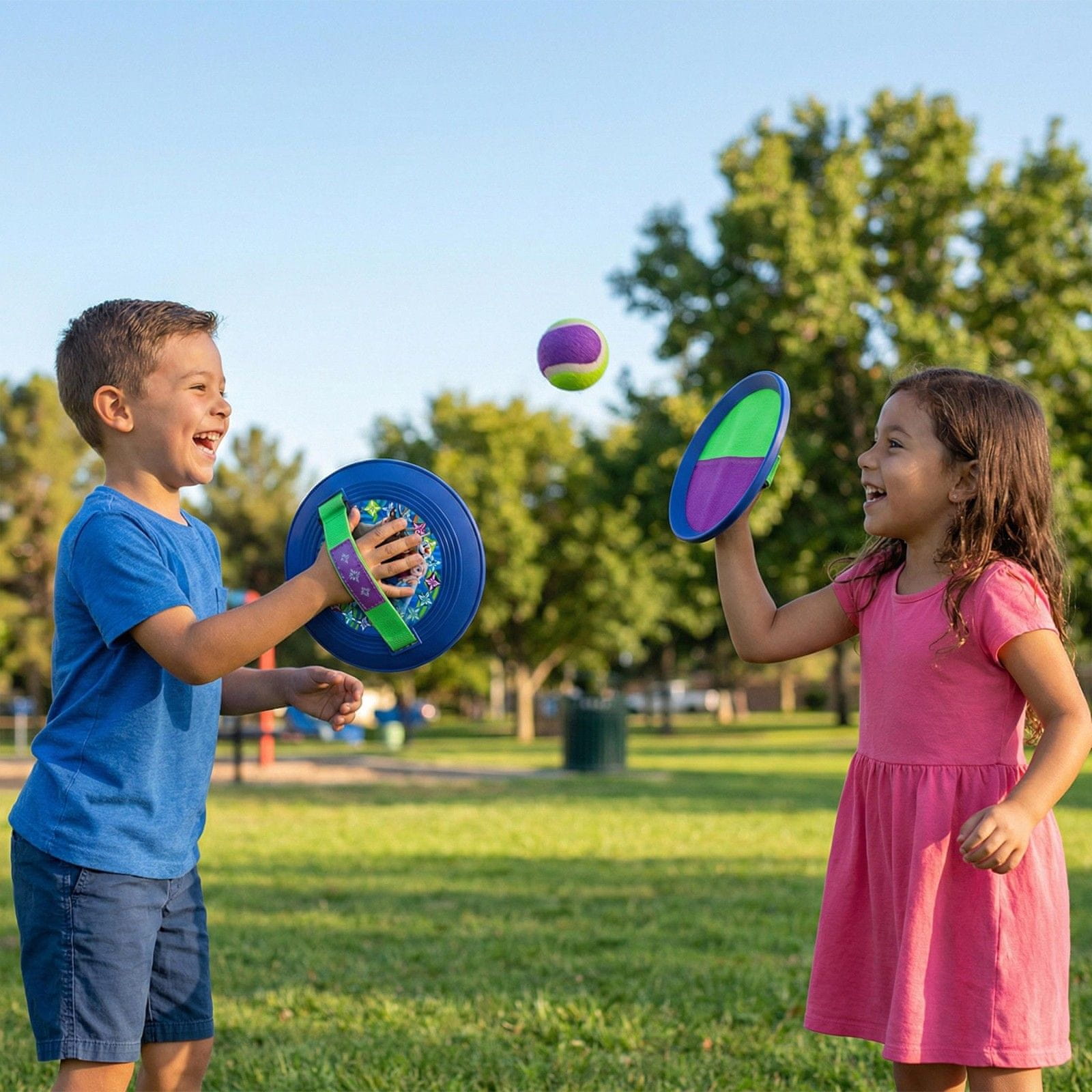 Komplet sestavljata dva lahka diska z velcro in žogica, ki se zlahka pritrdi na površino palet, tako da se zlahka naučijo loviti in metati.