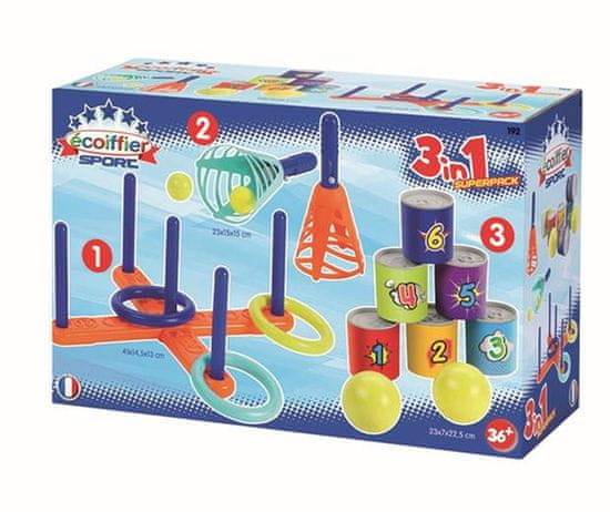Otrokom kupite komplet Ecoiffier. Vsebuje tri igre – lovljenje žogice, metanje obročev na križ in metanje pločevink. Vaši potomci se bodo zabavali v zaprtih prostorih in na prostem. Odvisno od tega, kam bo vzel komplet. Vsi deli so izdelani iz plastike. Igre so primerne za otroke od 3. leta starosti.