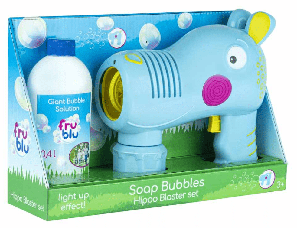 Fru Blu Hippo izstreljevalec mehurčkov hkrati izstreli številne mehurčke, ki jih osvetljuje LED lučka. Kompletu je priloženo tudi 400 ml milnice.