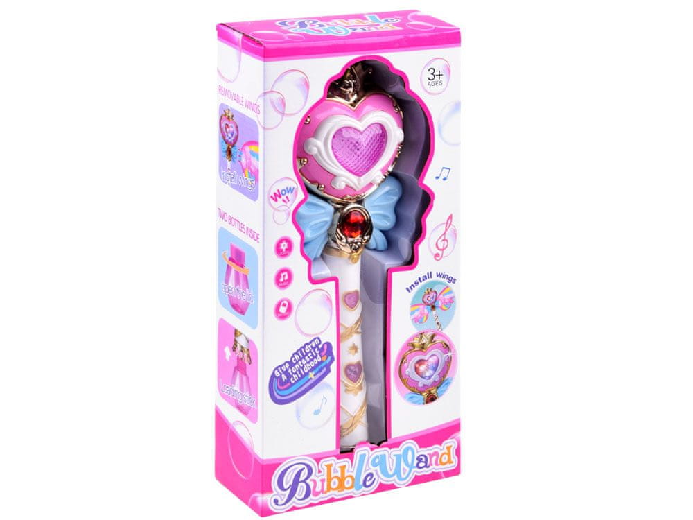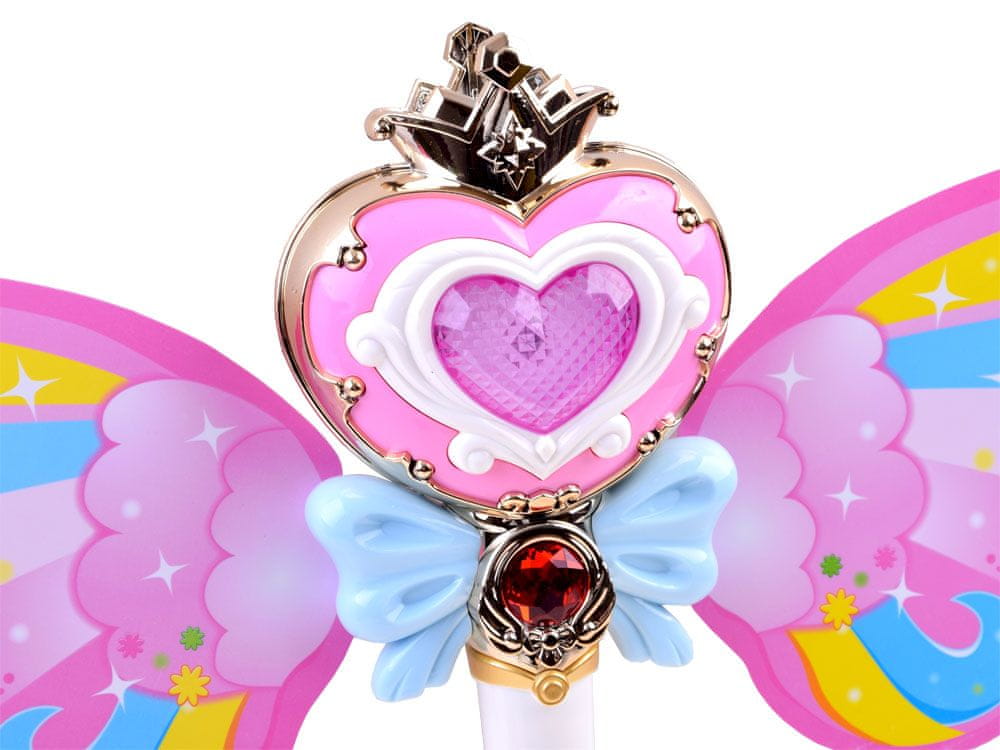 Interaktivna, čarobna palica, ki piha mehurčkemilo je popoln rekvizit za vsako malo vilo, ki rada čara in se uvaja v svet pravljic, pravljice, čarovnije. Očarljiva paličica z mavričnimi krili ima gumb, zahvaljujoč kateremu igrača spušča pisane milne mehurčke, predvaja veselo glasbo in sveti s pisano svetlobo.