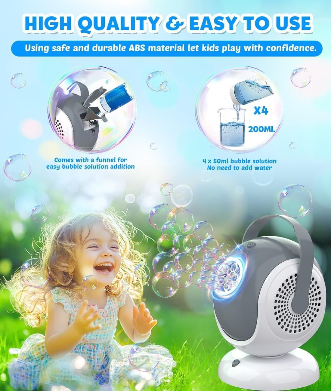 - Popolna avtomatizacija: Upravljanje z enim gumbom odpravlja potrebo po ročnem pihanju mehurčkov.