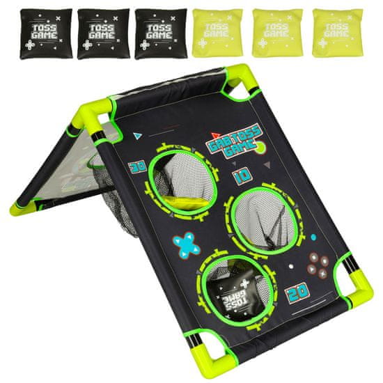 Zabavna in zasvojljiva igra „metanje vrečk“ bo navdušila vsakega otroka. Cilj igre je zadeti luknje v tarči z vrečkami. Set vsebuje 6 vrečk v dveh barvah, kar omogoča organizacijo tekmovanj v natančnosti metanja ali točkovanju (vsaka luknja ima različno število točk). Okvir plošče je izdelan iz plastike, material pa iz poliestra. Odlična je za igro doma in na dvorišču.