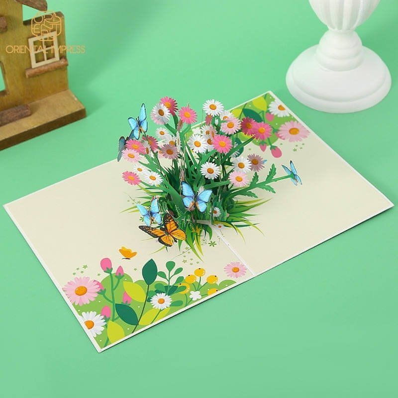 Odprete kartico in čaka vas presenečenje! Unikatne razglednice za posebne priložnosti. Inovativno in kreativno. Vsak, ki ga prejme, bo imel resnično poseben in čaroben spominek. Vsi elementi naših razglednic so natančno izrezani in nato prepognjeni za najboljši učinek. Vsak element 3D pojavne kartice je sestavljen iz več do ducata gibljivih elementov,ustvariti lepo, estetsko celoto… Sončen, lep dan, rože in metulji, ki letajo naokoli – ali ni to dovolj, da se vam za trenutek dvigne razpoloženje? Ta voščilnica je kot nalašč za rojstne dneve, imenske dneve in druge posebne priložnosti.
