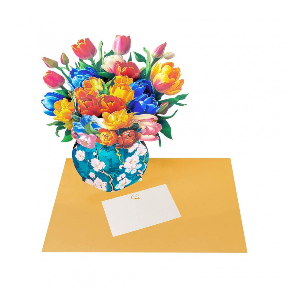 Odprete kartico in čaka vas presenečenje! Unikatne razglednice za posebne priložnosti. Inovativno in kreativno. Vsak, ki ga prejme, bo imel resnično poseben in čaroben spominek. Vsi elementi naših razglednic so natančno izrezani in nato prepognjeni za najboljši učinek. Vsak element 3D pojavne kartice je sestavljen iz več do ducata gibljivih elementov,ustvariti lepo, estetsko celoto… Barvit šopek poln tulipanov v roza, rumenih, oranžnih in modrih odtenkih bo navdušil vsakega ljubitelja teh pomladnih cvetlic. Kot nalašč za vsako priložnost – od rojstnih in imenskih dni do dneva žena ali darila v zahvalo.