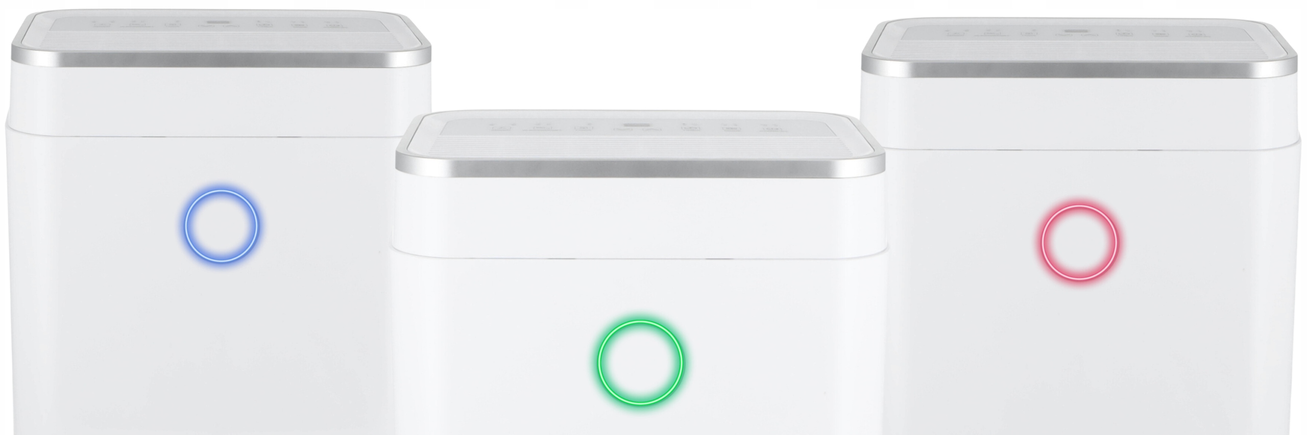 Razvlažilnik zraka Mission Air OPTIDRY 25 L/24H ima na sprednji plošči svetleč krog, ki signalizira trenutno območje vlažnosti v prostoru:
