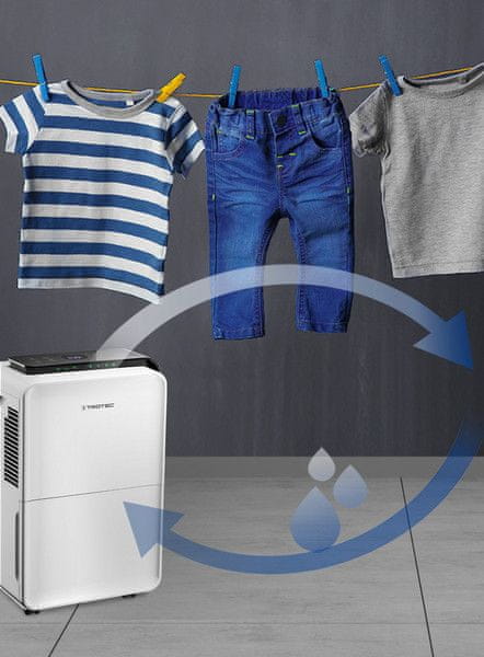 Poleg razvlaževanja zunanjega zraka lahko razvlaževalec priročno uporabljate tudi za sušenje perila, bodisi v pomoč ali kot popolno nadomestilo za običajen sušilni stroj. Funkcija sušenja perila (imenovana tudi način sušenja perila ali funkcija SuperDry) je primerljiva s tradicionalnim sušenjem na prostem. Barve ohranijo svoj sijaj, življenjska doba oblačil pa je daljša kot pri sušenju v običajnih sušilnih strojih, ob bistveno nižji porabi energije.